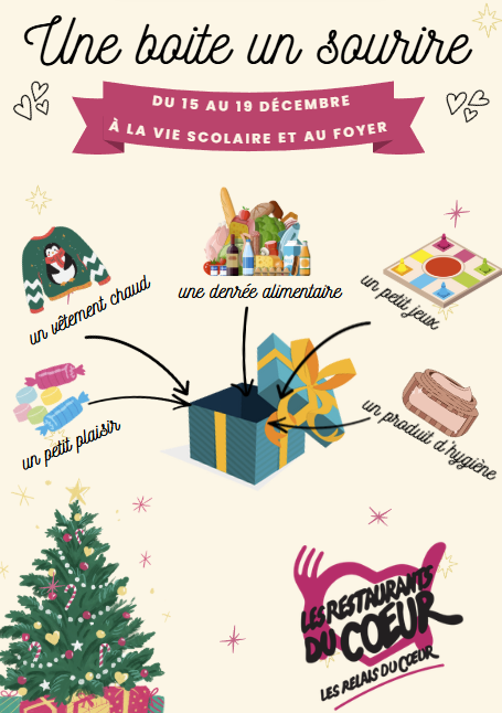 C'est avec enthousiasme que les Éco-délégués du lycée vous annoncent l'organisation d'une collecte solidaire en partenariat avec les Restos du Cœur !