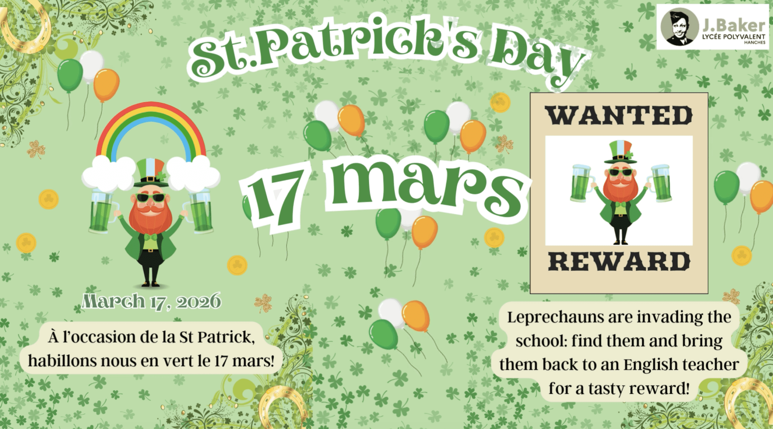 Ce Mardi 17 Mars, à l'occasion de la Saint Patrick, célèbre fête irlandaise, des Leprechauns vont envahir le lycée et se cacher dans les recoins les plus incongrus.
