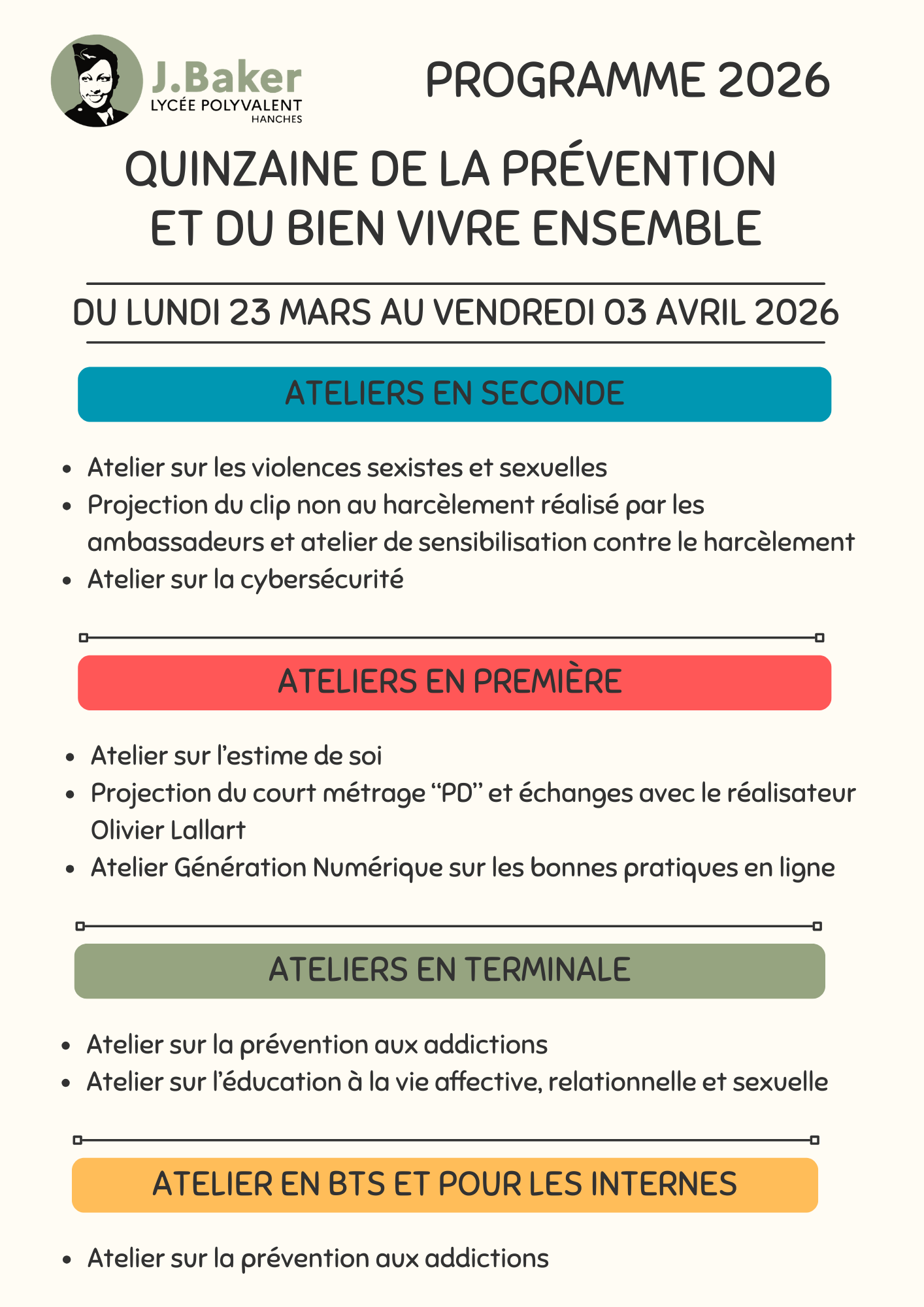 Ce temps fort de la vie du lycée, qui se déroulera du 23 mars au 3 avril 2026, sera une occasion privilégiée de faire vivre les valeurs de tolérance et d’ouverture à l’autre, chères à Joséphine Baker et à chacun d’entre nous. Différents ateliers seront proposés aux élèves. Toutes les classes d’un niveau suivront le même atelier, permettant aux élèves d’accéder aux mêmes informations et de partager une expérience commune.